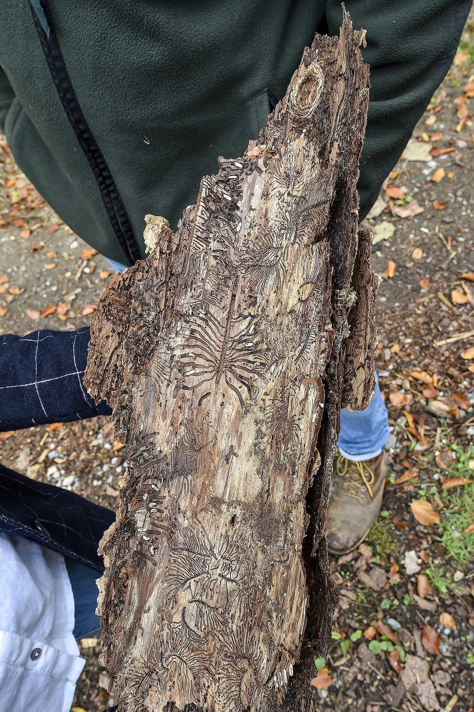 Borkenkäferspuren in einem Rindenstück in einem mittelhessischen Wald: Stürme oder Käferbefall vernichten große Waldgebiete in Europa. Fotos (3): Schmalenbach