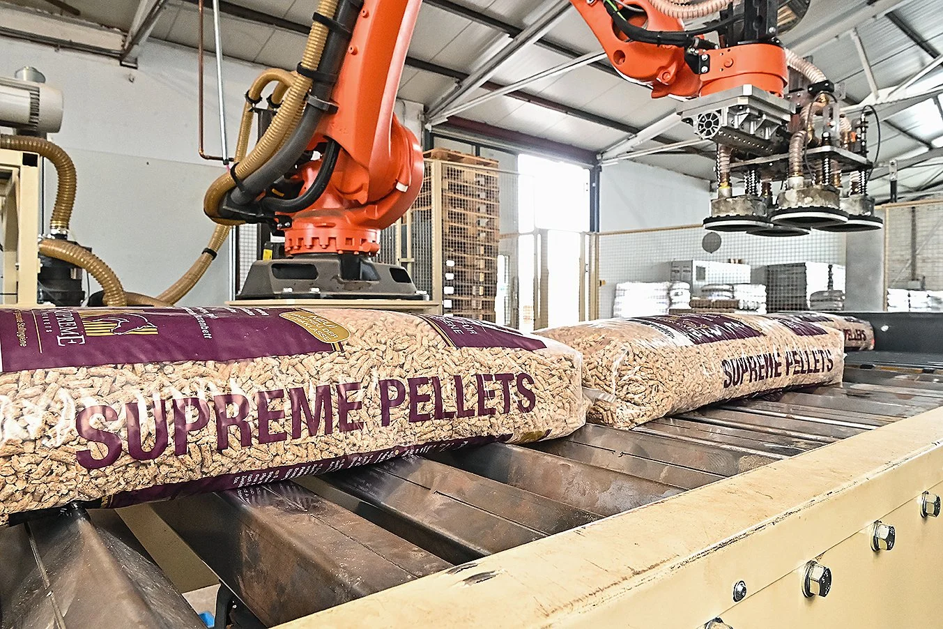 Nils Buchner dürfte froh sein, diesen „Arbeitskollegen“ zur Seite zu haben! Denn der übernimmt es für ihn, die länglichen Säcke von einem Förderband zu nehmen, sie zu heben und auf Paletten zu stapeln, während Buchner die Pellet-Absackanlage der „Westerwälder Holzwerke“ (WWHW) bedient. Elf Lagen schichtet der „Kollege“ übereinander, bestehend aus je fünf Säcken – jeder davon 14 Kilogramm schwer. Dieser „Kollege“ jedoch ist kein Mensch, sondern ein Roboter. Und er greift die Säcke auch nicht, sondern packt sie mittels Unterdruck mit vier Saugnäpfen. „Supreme Pellets“ steht auf diesen Säcken. Ist da also etwas anderes drin als die bewährten Westerwälder Holzpellets?